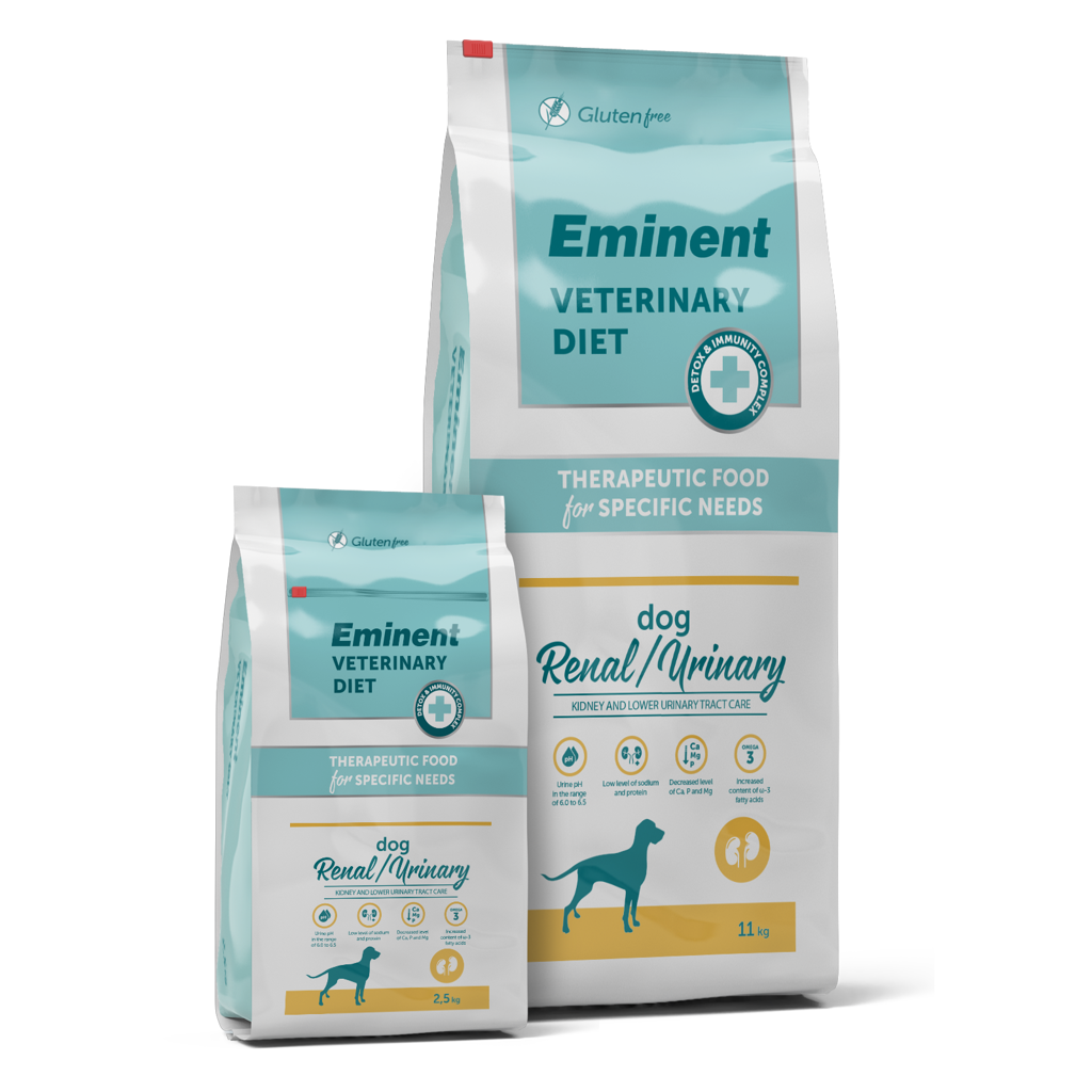Tu může zajistit krmivo EMINENT VETERINARY DIET DOG RENAL/URINARY. Tato speciální receptura pomáhá zpomalit selhávání ledvin. Nižší obsah některých minerálů brání tvorbě nových močových kamenů. Jako jednu z funkčních složek krmiva používáme brusinky. Obsahují proantokyanidiny, které mají schopnost zastavit ulpívání bakterií na stěnách močového měchýře a vytváření jejich kolonií. Prevence bakteriálních infekcí je výsledkem tohoto mechanismu.